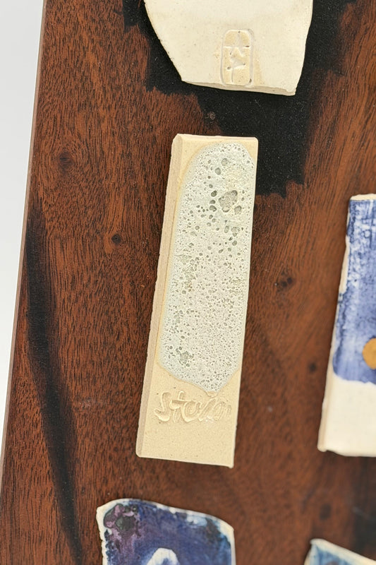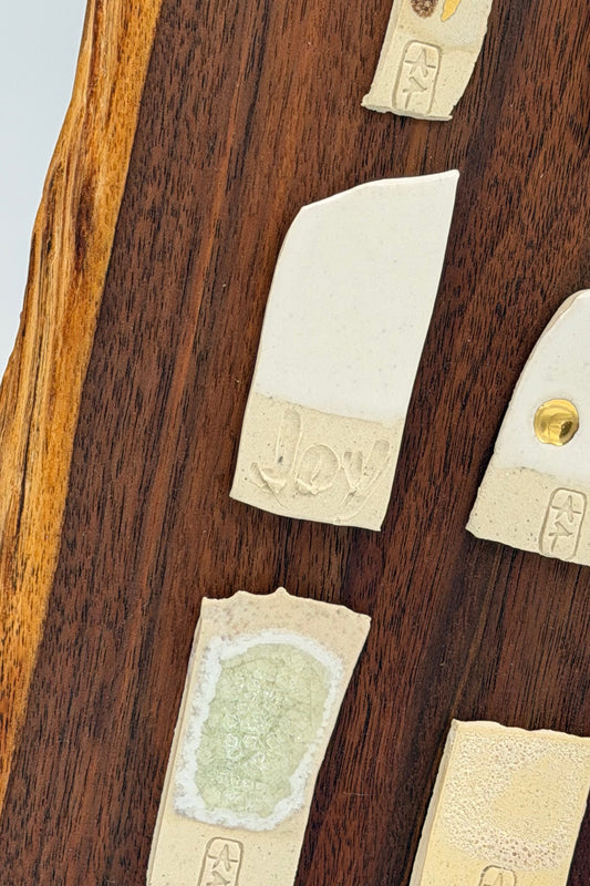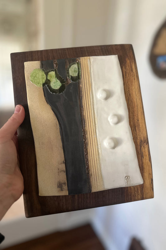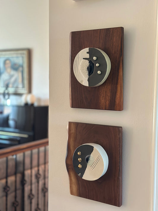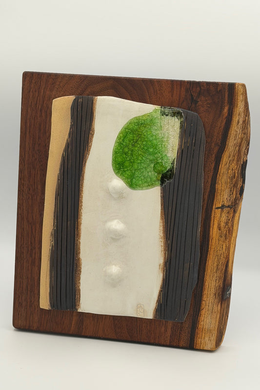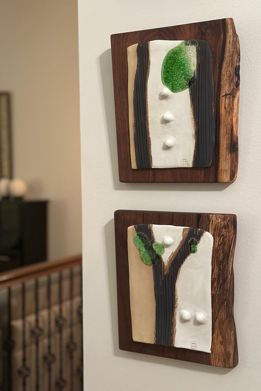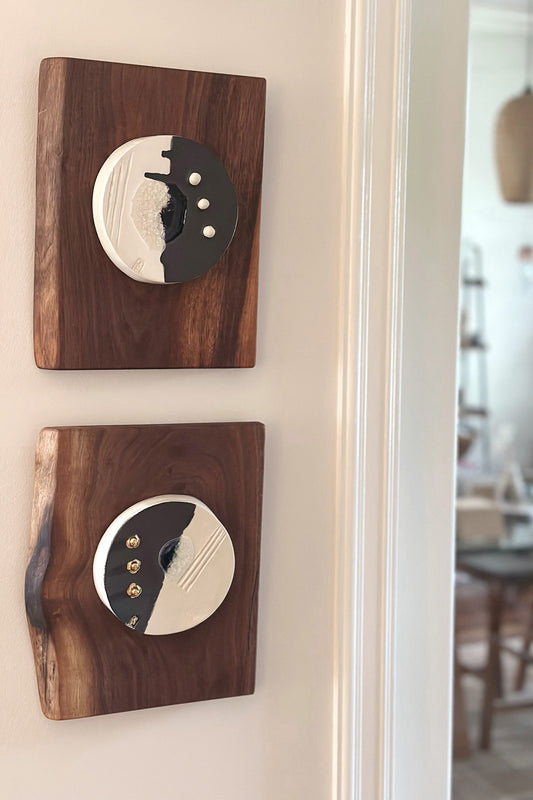 The pairing of ceramic and wood emerged organically in my work, each material carrying its own rhythm - clay shaped by hand, wood guided by grain - creating artworks that function as both wall art and sculptural pieces.