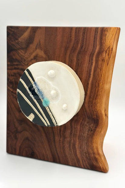 Stoneware, sea glass, glaze & walnut wood