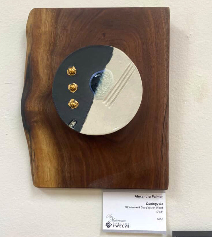 Stoneware, sea glass, glaze, gold & walnut wood