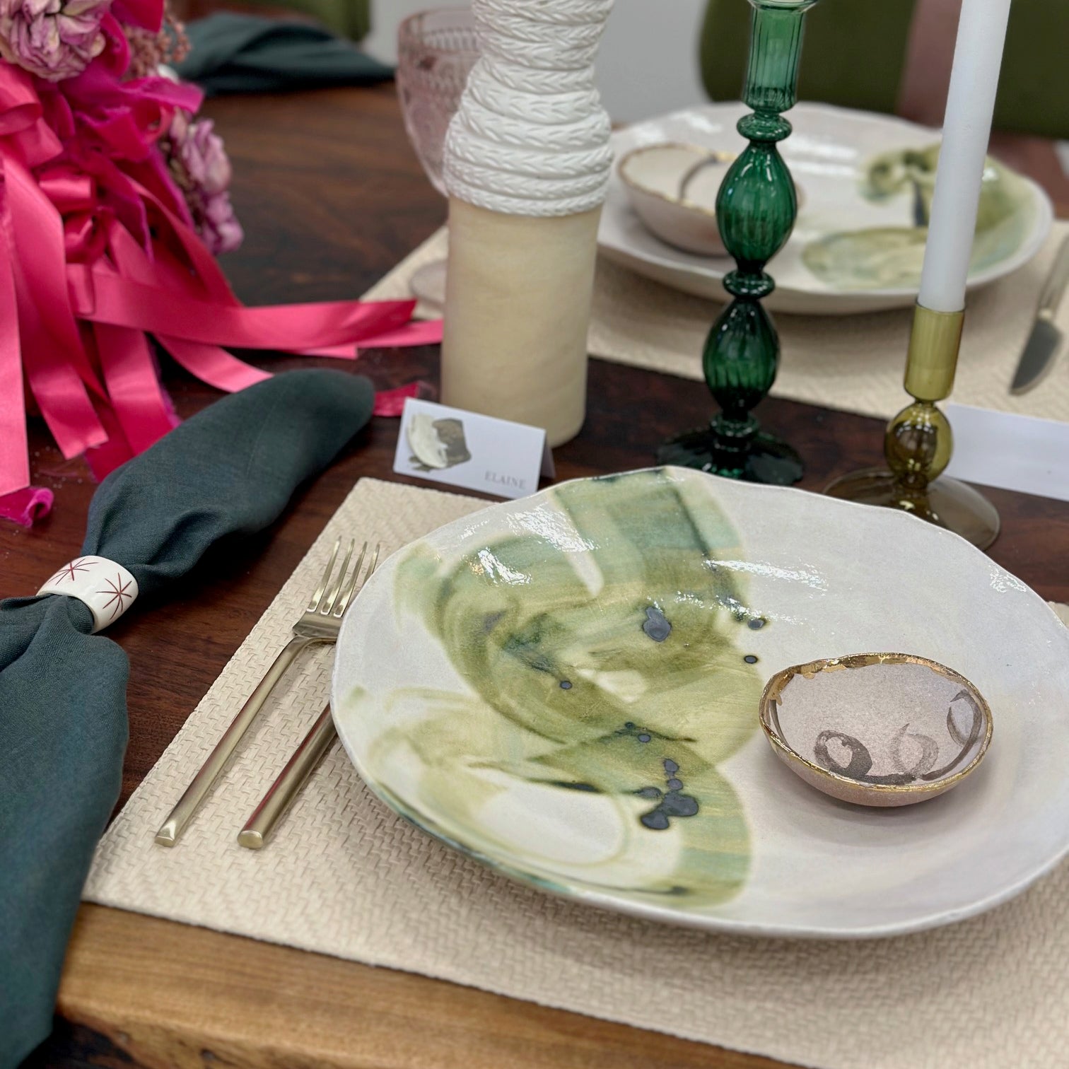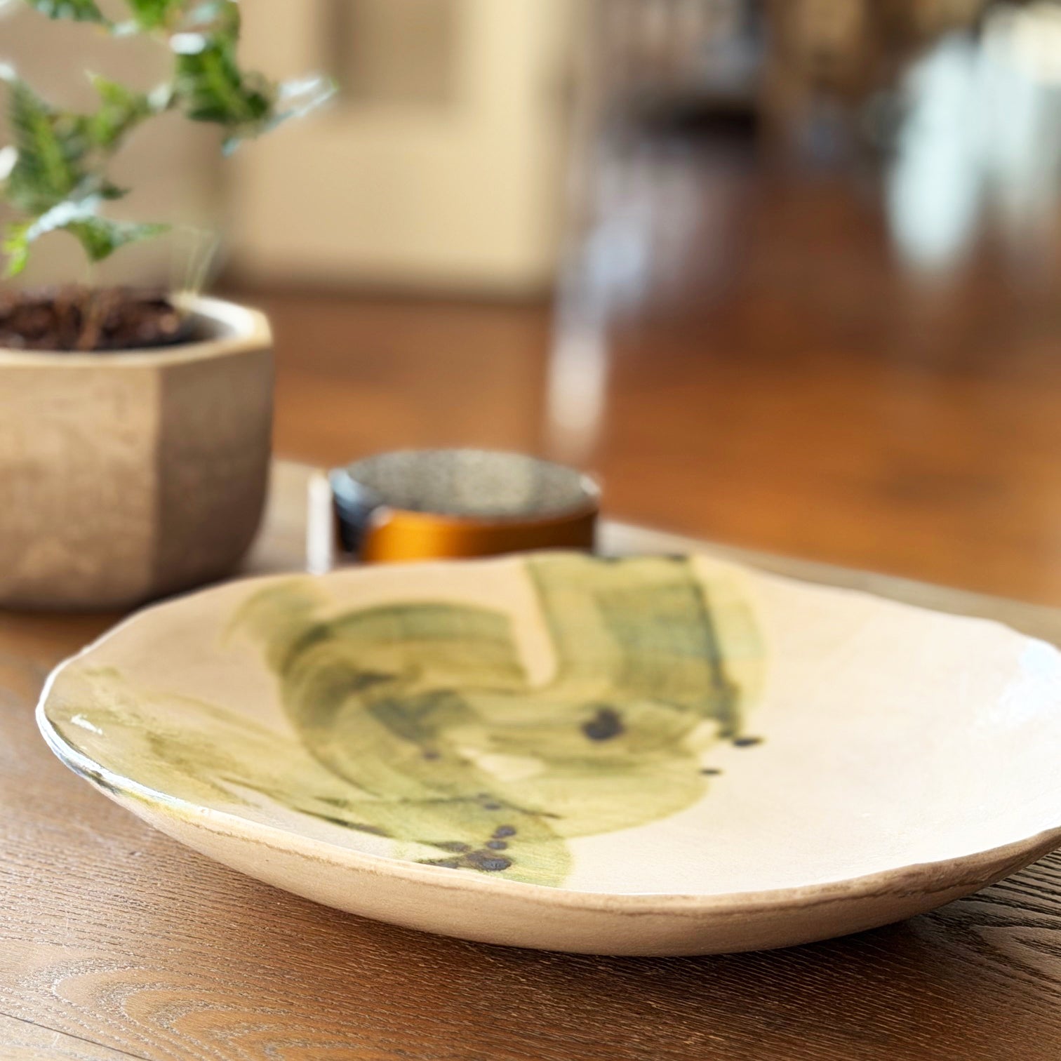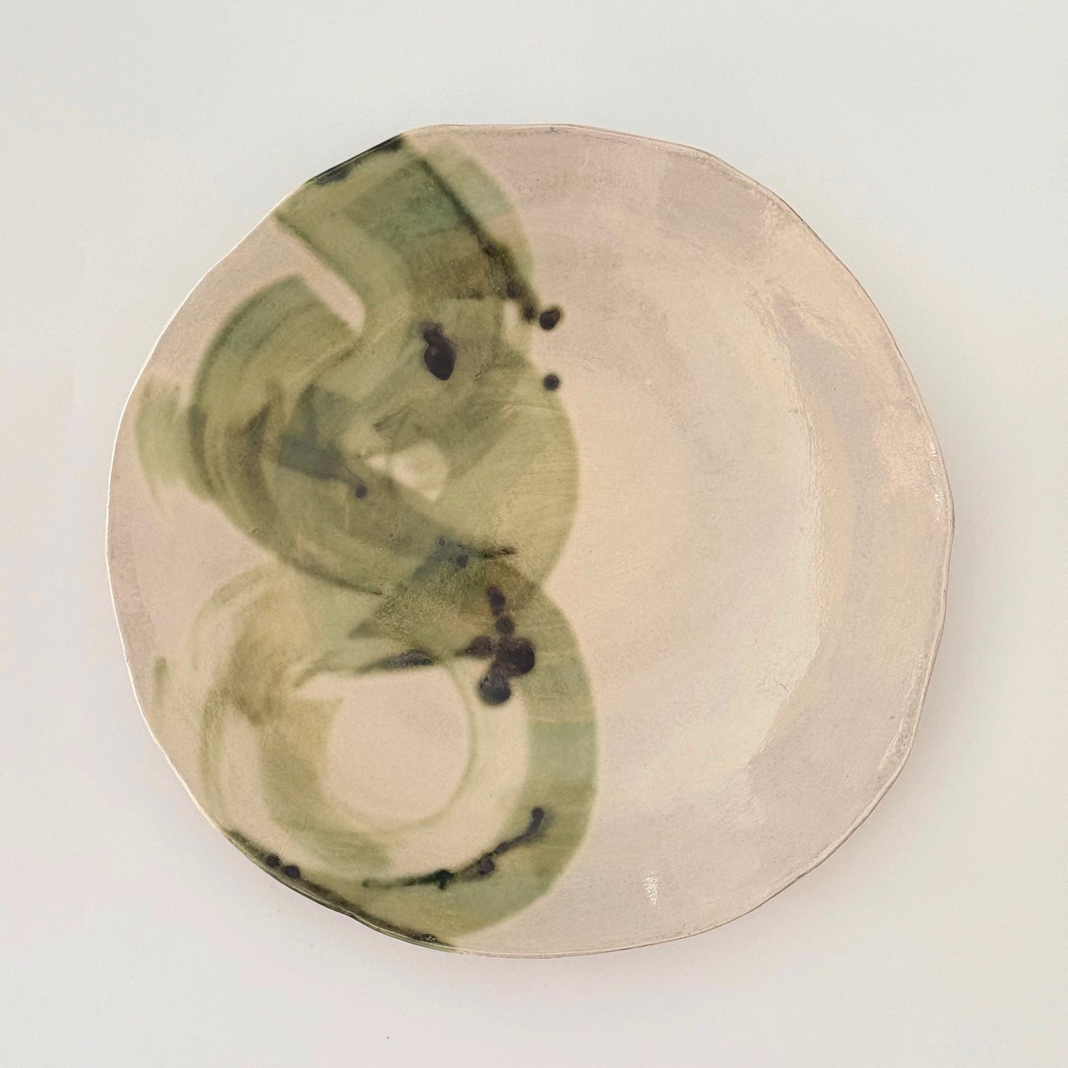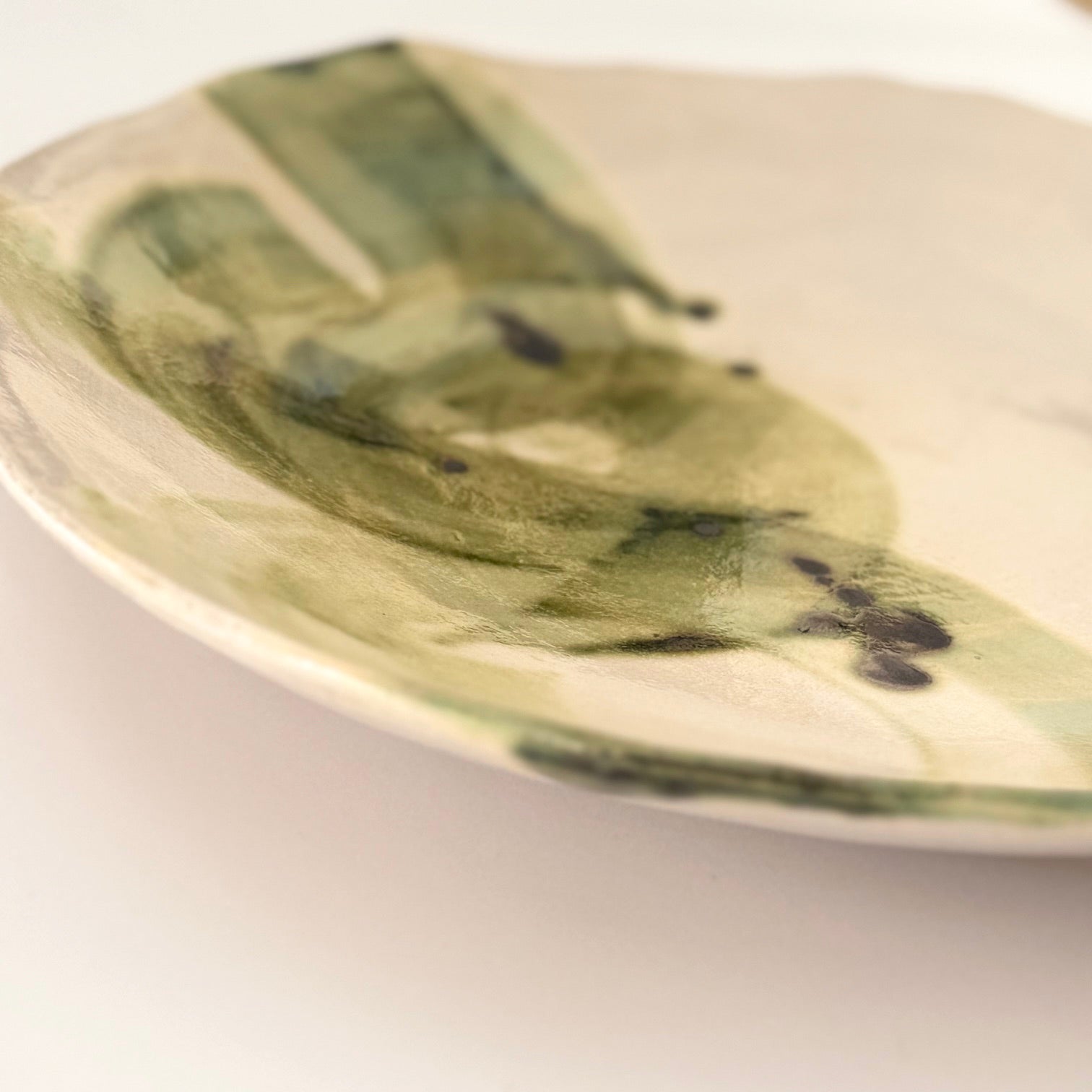 A whisper of hand-painted green brushstrokes floats across a creamy, glossy surface. Its organic, hand-shaped edge and fluid marks bring the gentle beauty of nature into any space.