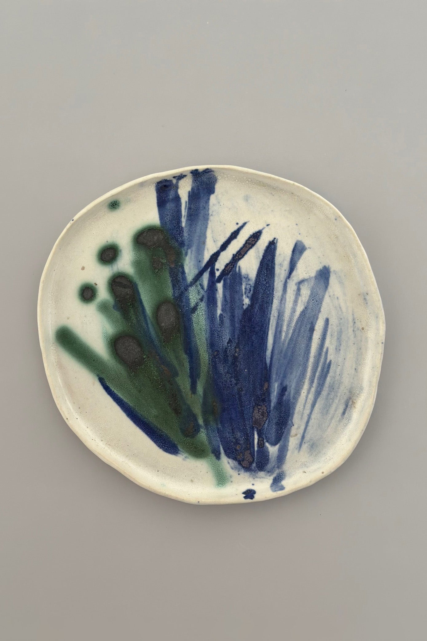 Hand-crafted small ceramic plate featuring abstract brushstrokes inspired by peacock hues. Perfect for tapas snacks, a resting place for spoons, tea bags, jewellery, or everyday objects.