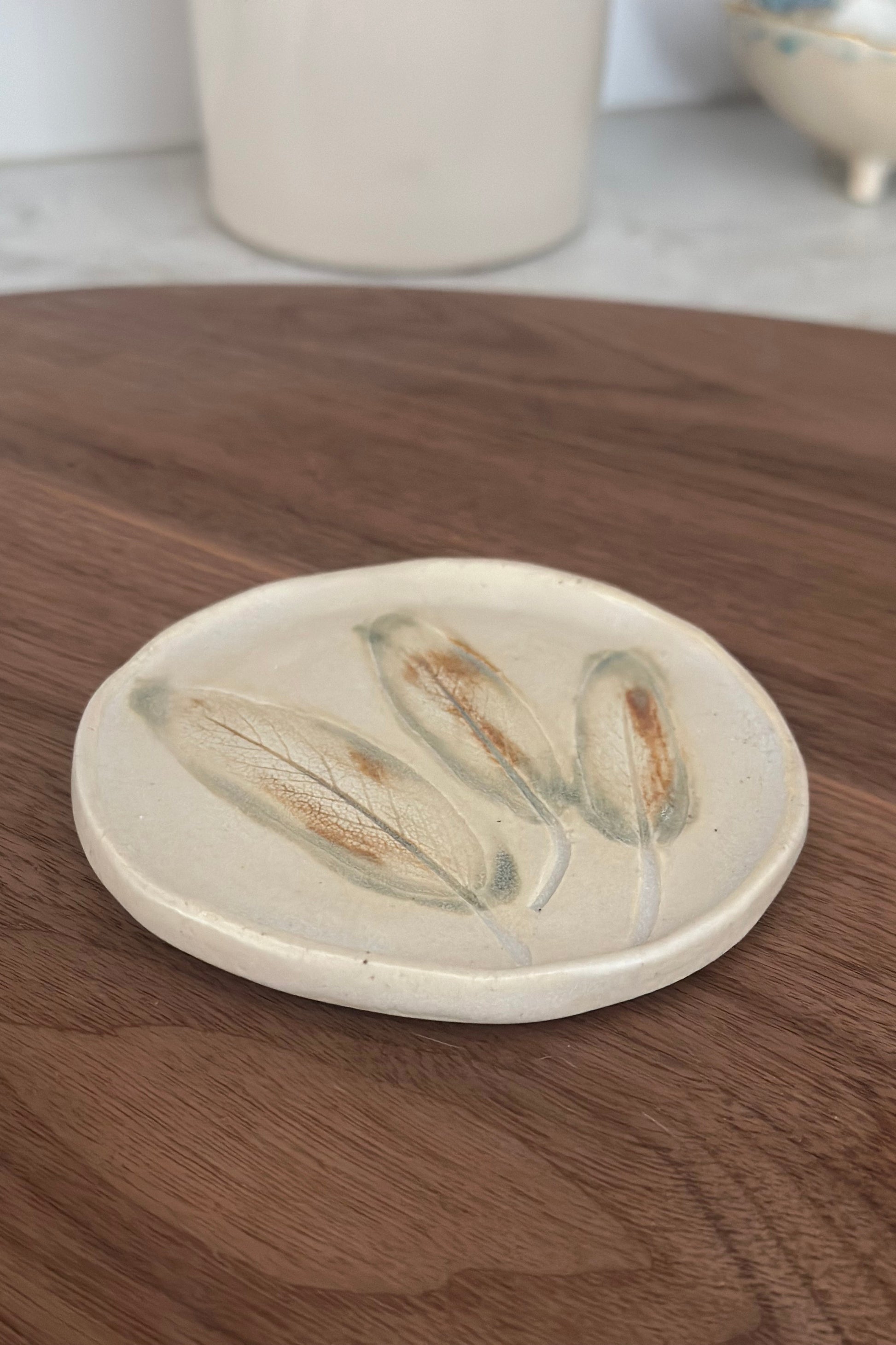 Hand-crafted small ceramic plate with a sage leaf design. Perfect for tapas snacks, a resting place for spoons, tea bags or everyday objects.